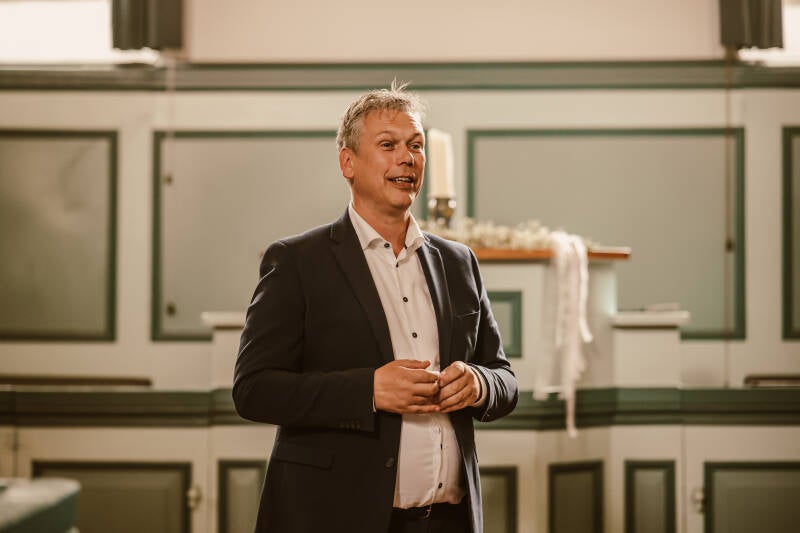 Zijn toespraak was met persoonlijke aandacht voor bruidspaar en uitnodigend voor alle gasten.